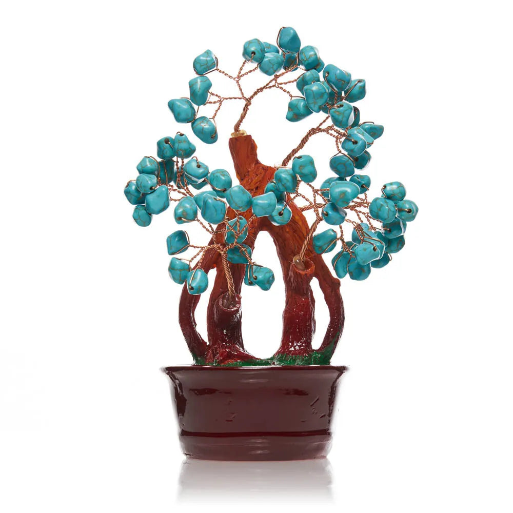Pomul decorativ cu pietre semipretioase din Turcoaz va va infrumuseta locuinta sau biroul. Tucoazul este o piatra de purificare care inlatura energia negativa, conferind protectie. Fortifica meridianele corpului, campurile energetice subtile, intareste sistemul imunitar, regenereaza tesuturile, alunga poluarea, infectiile virale, ingrijind corpul in ansamblu. Purtata pe chakra gatului inlatura vechile angajamente si inhibitiile, pemitand sufletului sa se exprime mai mult. Dimensiuni : Inaltime : aprox. 18,5cm